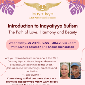 Introduction to Inayatiyya Sufism | with Munira & Shams | Via Zoom Zoom Link: https://us02web.zoom.us/j/86104683366?pwd=jeSL4k3vJg5F64oh6U0OPRWPMSTbX0.1 29 Apr 7:00 PM - 8:30 PM